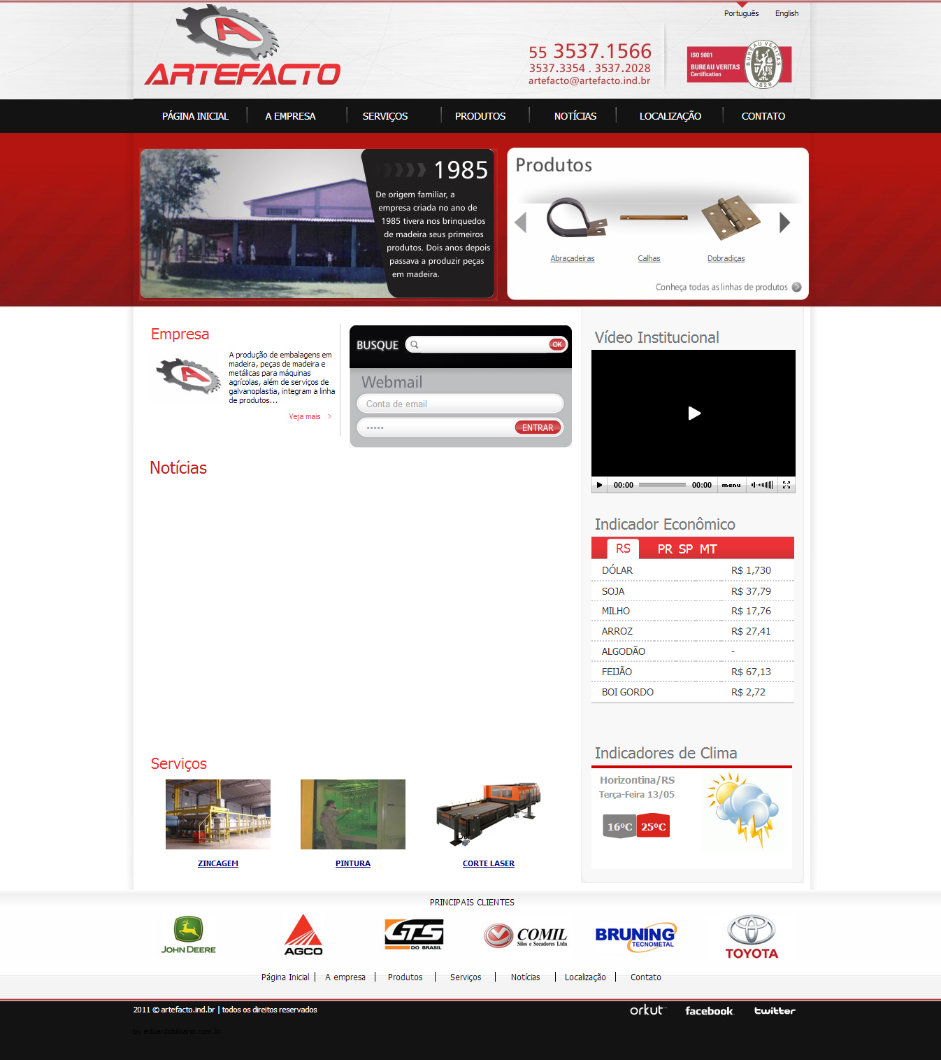 Website institucional da empresa Artefacto. O site contém os dados institucionais, descrição da empresa, serviços e produtos oferecidos e fabricados e notÃcias atualizadas pela própria equipe da empresa.O website foi criado utilizando HTML, CSS e PHP. Possui um gerenciador de conteúdo para os dados básicos, notÃcias e para o catálogo de produtos. Possui, também, um banner animado com tecnologia Flash, mostrando o histórico da empresa.